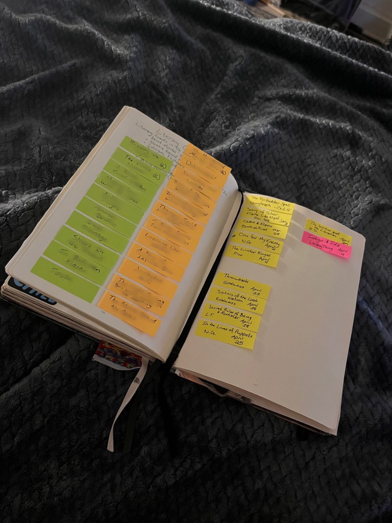 The green & orange are the books in my two categories that I need to read. The yellow tabs are books that have been released or are going to be released soon.
